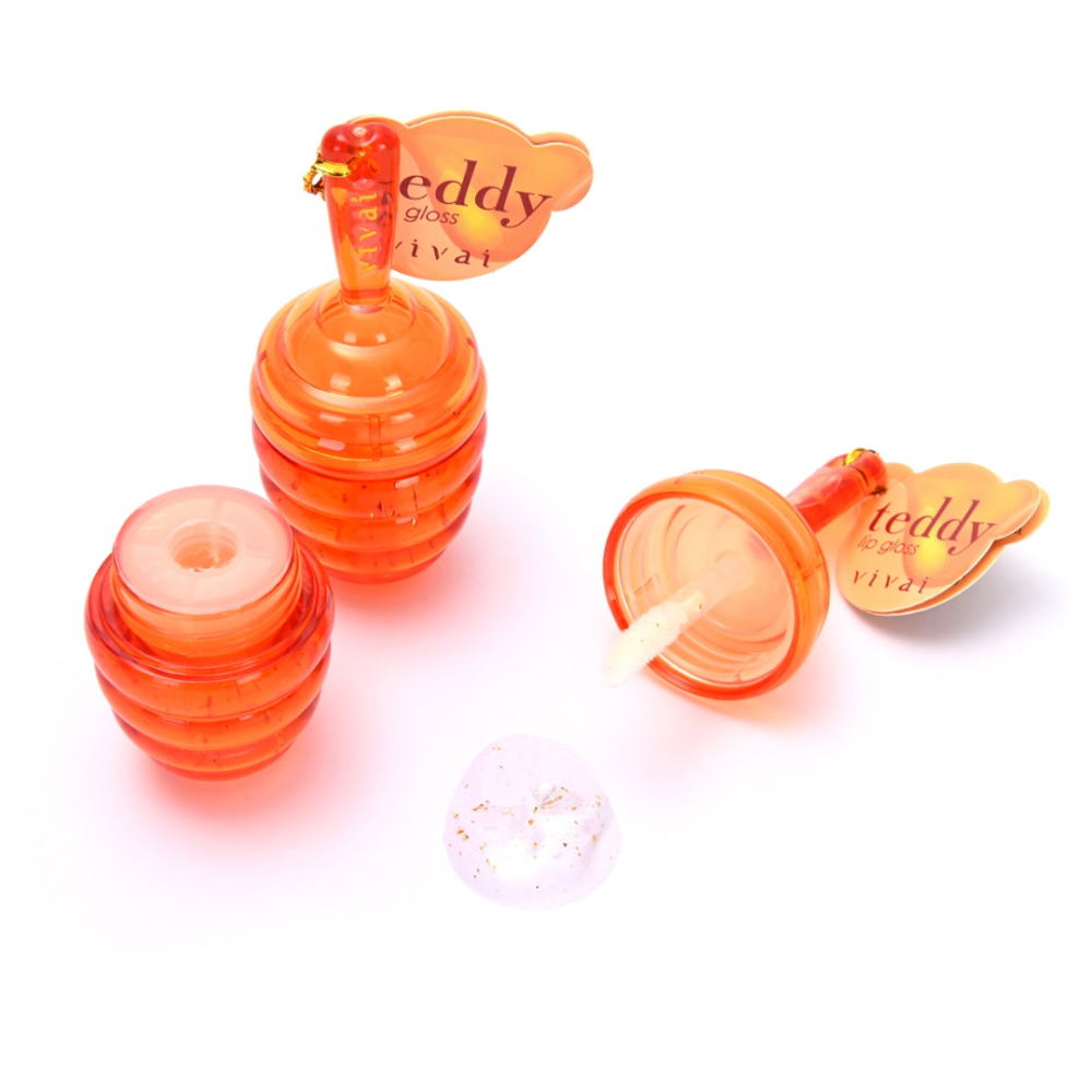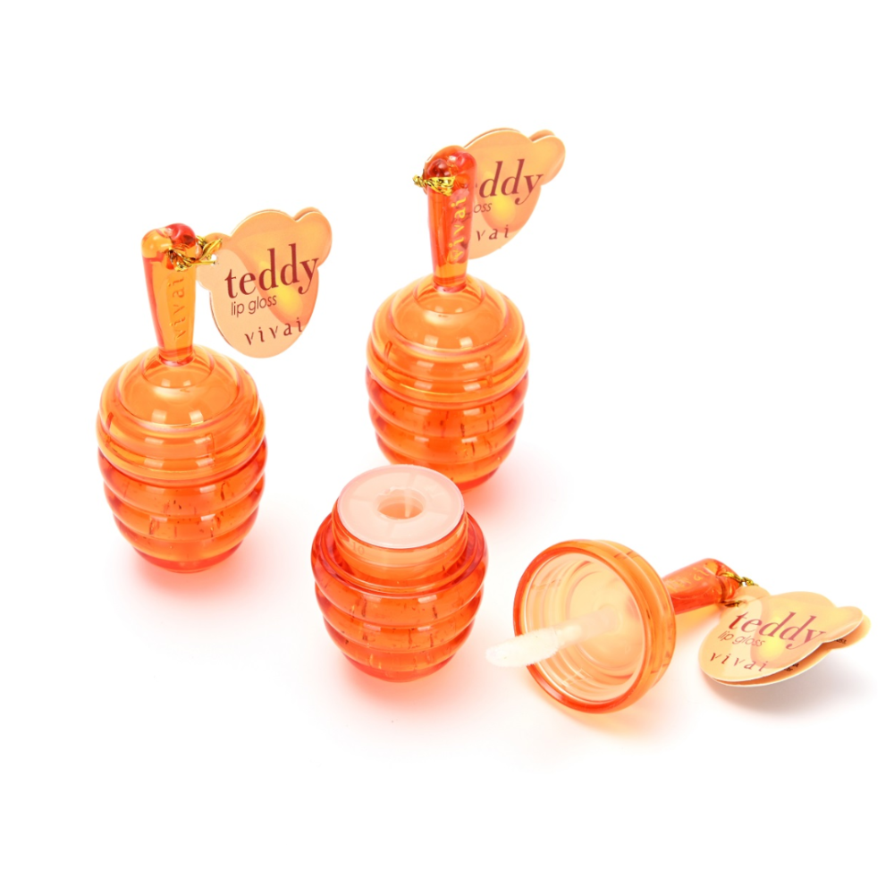 Lip Gloss Teddy Vivai em formato de mel, com brilho radiante e textura leve que deixa os lábios macios e hidratados. Embalagem criativa e divertida, perfeita para realçar a maquiagem com um toque único.