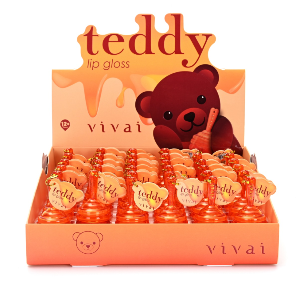 Lip Gloss Teddy Vivai em formato de mel, com brilho radiante e textura leve que deixa os lábios macios e hidratados. Embalagem criativa e divertida, perfeita para realçar a maquiagem com um toque único.